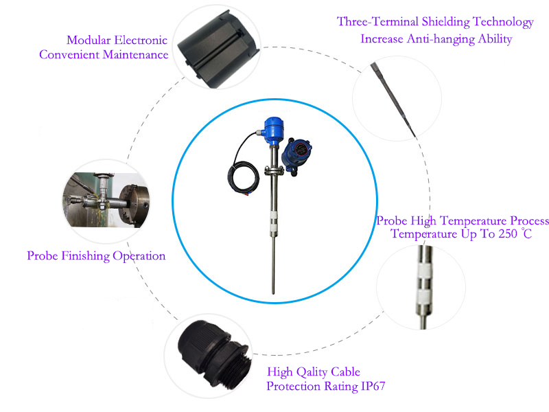 UVCR RF Admittance Level Switch is a new product developed from capacitive level switch.Anti-hanging material (the material adhered by the sensor is called hanging material) has better performance, more reliable work, more accurate measurement and wider applicability.The meaning of "admittance" in "RF Admittance" is the reciprocal of impedance in electricity.It is composed of capacitive reactance ?impedance and inductive reactance. And "radio frequency" is high frequency,Therefore, radio frequency admittance technology can be understood as a method of measuring admittance with high-frequency current. The important difference between RF admittance technology and capacitance technology is that it adopts three-terminal shielding technology and the diversity of measurement parameters, which not only solves the problem of parasitic capacitance temperature drift of connecting cables, but also solves the problem of sensor hanging.