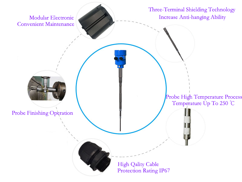 UVCR RF Admittance Level Switch is a new product developed from capacitive level switch.Anti-hanging material (the material adhered by the sensor is called hanging material) has better performance, more reliable work, more accurate measurement and wider applicability.The meaning of "admittance" in "RF Admittance" is the reciprocal of impedance in electricity.It is composed of capacitive reactance ?impedance and inductive reactance. And "radio frequency" is high frequency,Therefore, radio frequency admittance technology can be understood as a method of measuring admittance with high-frequency current. The important difference between RF admittance technology and capacitance technology is that it adopts three-terminal shielding technology and the diversity of measurement parameters, which not only solves the problem of parasitic capacitance temperature drift of connecting cables, but also solves the problem of sensor hanging.
